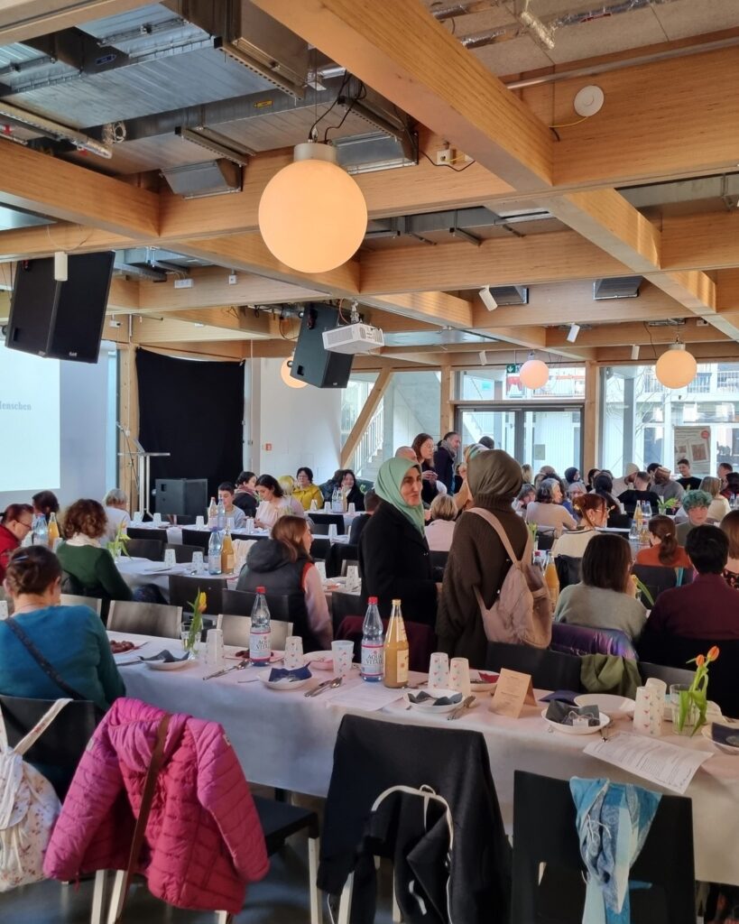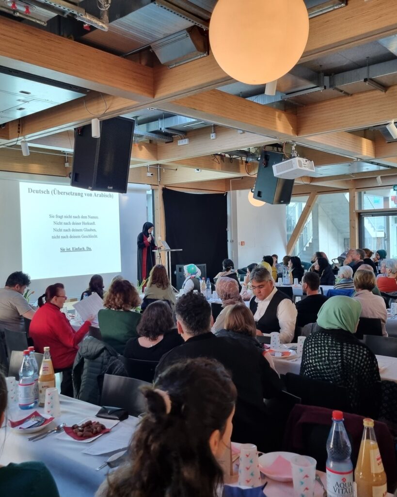 Beim Interkulturellen Fastenbrechen im Collegium Academicum wurde in gemeinsamer Runde das Fasten gebrochen – begleitet von einem Text, der aus verschiedenen Statements zum Thema „Menschenwürde schützen“ entstand. 25 ehrenamtliche Köchinnen von EVA e.V. bereiteten vielfältige Speisen zu, die in gemeinschaftlicher Atmosphäre genossen wurden. Die Veranstaltung trug zur Förderung des interkulturellen Dialogs bei. Ein Dank gilt dem Organisationsteam von EVA e.V., dem Quartiersmanagement Hasenleiser und dem Collegium Academicum für die Umsetzung.