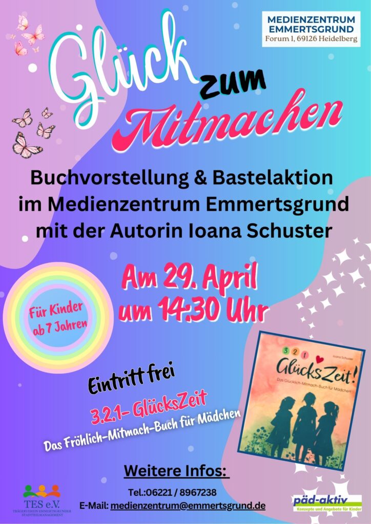 Ein besonderes Highlight erwartet euch am 29. April um 14:30 Uhr im Medienzentrum Emmertsgrund: Die Autorin Ioana Schuster stellt ihr fröhliches Mitmach-Buch „GlücksZeit!” vor und lädt Kinder zu einer kreativen Bastelaktion ein.