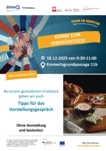 Im letzten Jobfrühstück dieses Jahr gibt es bei einem gemütlichen Frühstück Tipps für das nächste Vorstellungsgespräch. Das BIWAQ Team freut sich, wenn jeder Teilnehmer und Teilnehmerin etwas Typisches aus ihrer Kultur mitbringt. Das kann zum Beispiel ein Gebäck oder eine andere Kleinigkeit zu essen sein.