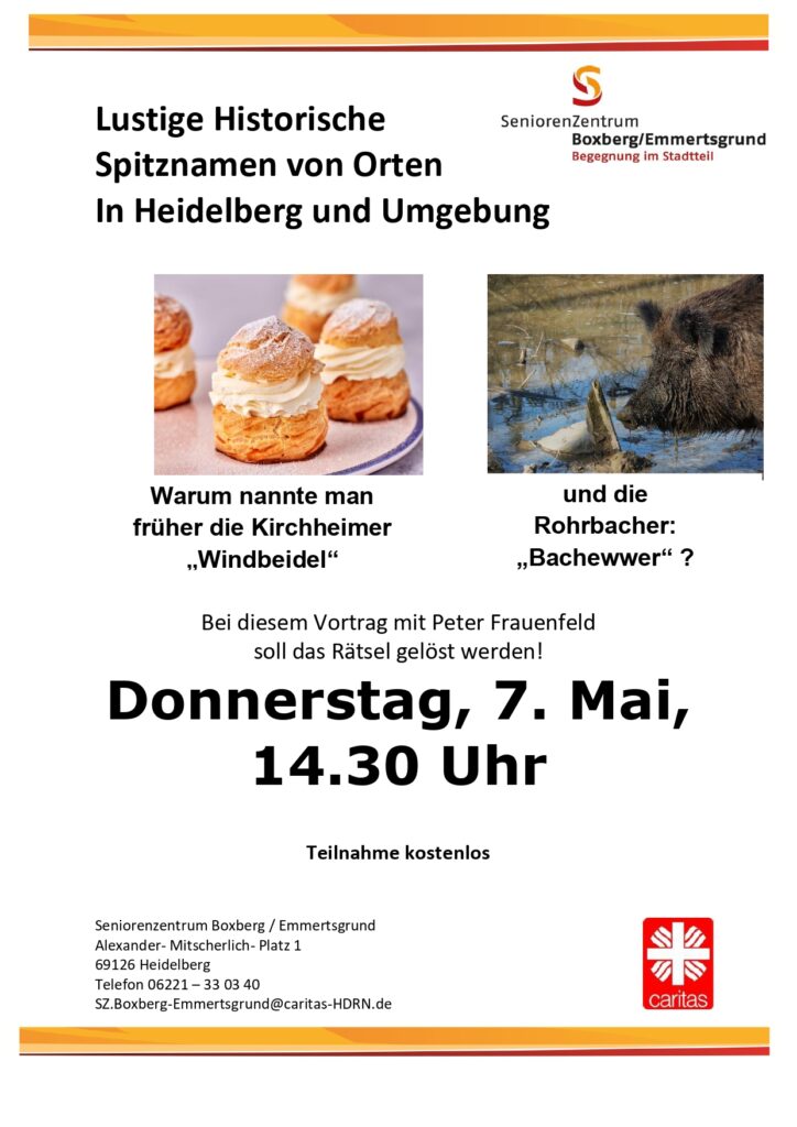 Donnerstag, 7. Mai, 14.30 Vortrag zu Ortsspitznamen in Heidelberg und Umgebung , mit Peter Frauenfeld