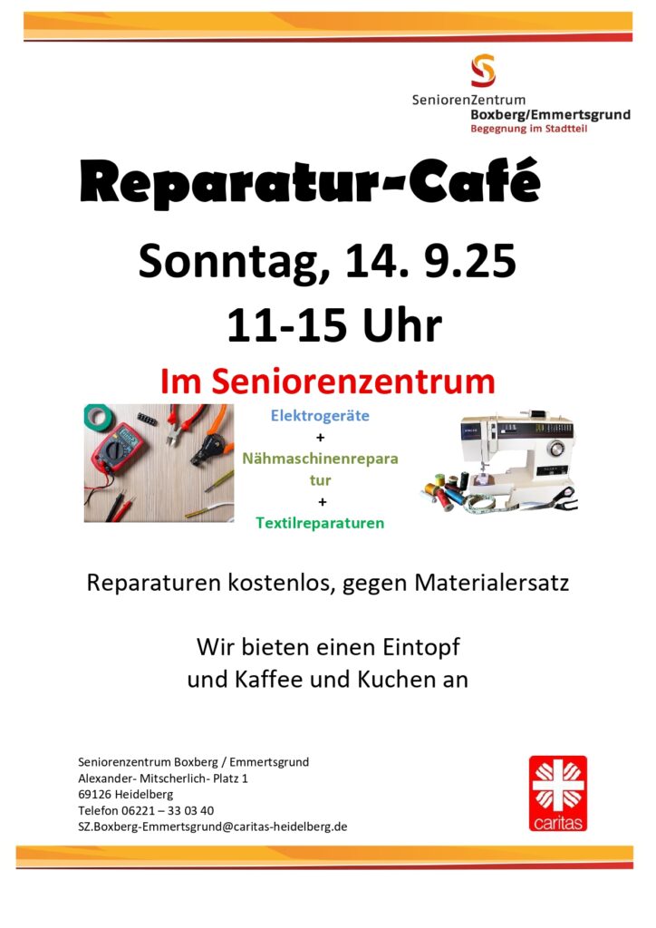 Sonntag, 14. September 11 Uhr Reparaturcafé , diesmal im Seniorenzentrum! Elektrogeräte, Nähmaschinen, Textilreparatur. Es gibt einen Eintopf und Kaffee und Kuchen.