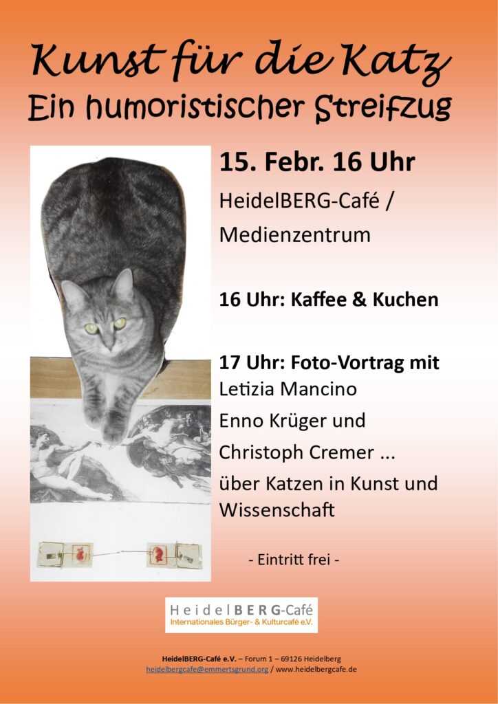 Die Katzenkenner und -liebhaber Letizia Mancino, Enno Krüger und Christoph Cremer zeigen die ketzerische Kunst von Kessie und berichten gutgelaunt aus kulturhistorischer und naturwissenschaftlicher Sicht und anhand zahlreicher Foto-Dokumente über das künstlerische Katzenleben. Bereits vor dem Fotovortrag spielt der Chorleiter des Nach-barschaftschors, Peter Hammacher, Katzenmusik auf dem Klavier.